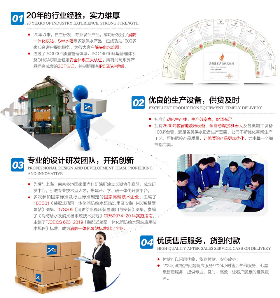 我公司以產(chǎn)品為導(dǎo)向與國家重點(diǎn)科研院所建立長期協(xié)作聯(lián)盟,成立了研發(fā)中心并先后開發(fā)了幾十個(gè)專利項(xiàng)目,抗浮箱泵一體化成套設(shè)備等多個(gè)產(chǎn)品被列為江蘇省高新技術(shù)產(chǎn)品。主編的...